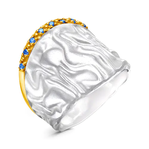 Широкое серебряное кольцо Ena коллекции Crumpled Silk, выполненное в уникальном стиле мятого металла и украшенное завораживающей дорожкой сверкающих фианитов. Мятые фактуры — это всегда невероятно! Такие изделия заставляют обращать на себя внимание. С ними хочется чуть больше жестикулировать, их хочется трогать, поправлять и демонстрировать. Кольцо Ena идеально сочетается со стилем бохо, минимализмом, классикой и романтикой. Смягчает строгость конструктивизма — например, отлично смотрится с деловым костюмом, а также в комплекте с серьгами из одноименной линейки.Покрытие